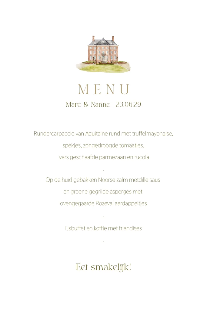 Menukaart diner trouwlocatie kasteel amerongen getekend