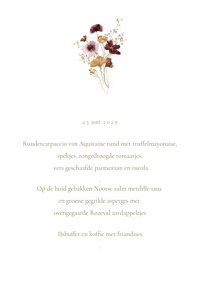 Menukaart voor een huwelijk met droogbloemen in groen en goudfolie. Dit menukaartje past goed bij de trouwkaarten in deze serie. De ronde hoeken maken deze kaart extra speciaal. Bewerk zelf de teksten en bestel een proefdruk.