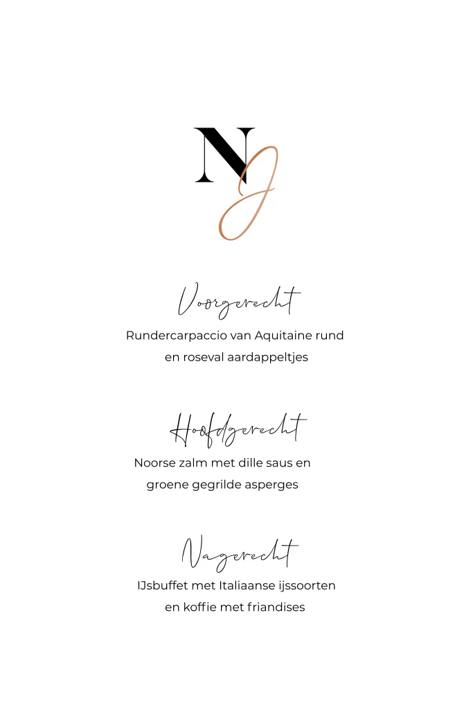 Prachtige menukaart in een originele boog vorm. Bovenaan staan de initialen, waarvan er eentje is gedrukt in koperfolie voor een extra mooi accent. Bewerk zelf de teksten op dit menukaartje.