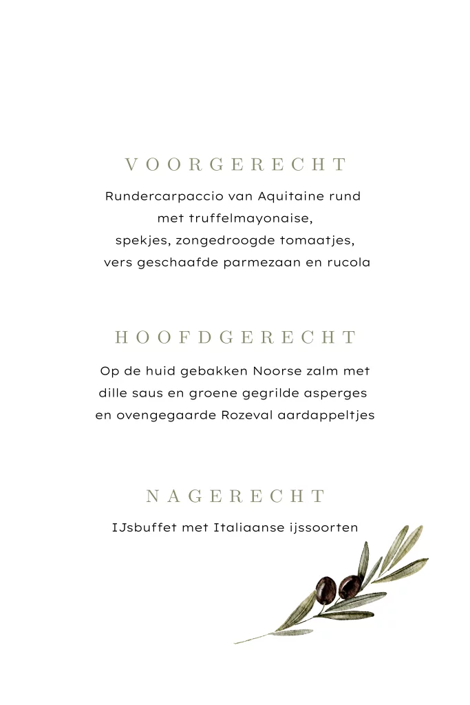 Deze stijlvolle menukaart heeft een witte achtergrond en onderaan staat een olijftak. Dit takje is handgeschilderd in groene en paarszwarte kleur. Past mooi bij onze trouwkaarten met olijftakjes.