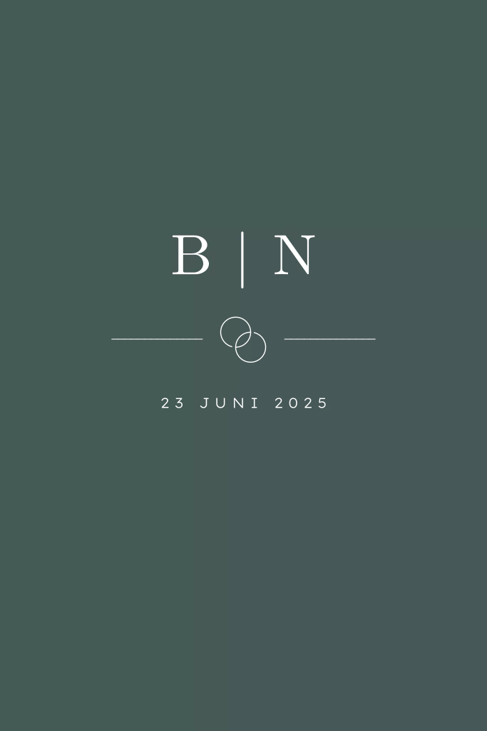 Chique trouwkaart met een prachtige donkergroene achtergrond. Daarop staan initialen in echt goudolie en daaronder trouwringen in goud. De achtergrondkleur en foliekleur kan je zelf naar wens aanpassen.