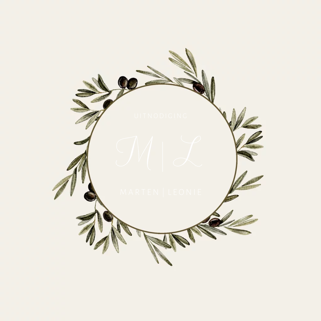 Vierkante trouwkaart met een krans van olijftakken. In de krans staan initialen in goudfolie. De achtergrond van deze huwelijks uitnodiging kan je zelf aanpassen.