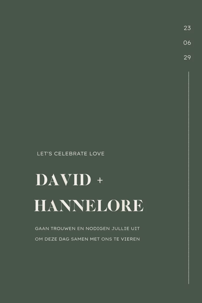 Enkele trouwkaart in klassieke stijl met met een groene achtergrond. De letters op deze kaart zijn beige hoogglans en achterop de kaart staan de gegevens van de trouwdag. Heb je hulp nodig om alle kaarten van jullie wedding stationary bij elkaar te laten passen, laat het ons even weten.