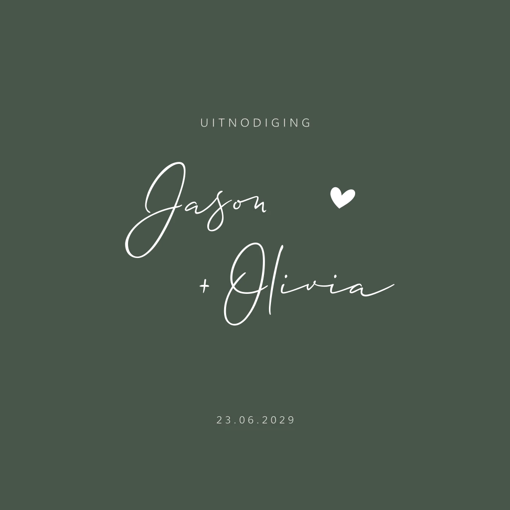 Groene vierkante trouwkaart met goudfolie en klein hartje