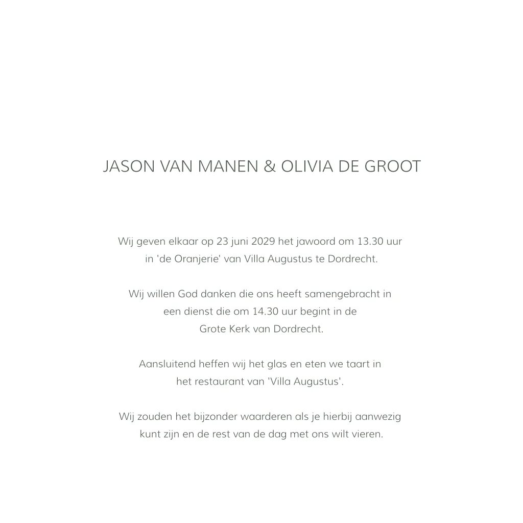 Ben je op zoek naar een klassieke trouwkaart? Dan is deze groene trouwkaart vast wat voor jullie. De donkergroene achtergrond matcht heel mooi met de goudfolie letters. Deze letters liggen op het kaartje en geven de kaart een mooie luxe uitstraling. Je kunt de goudfolie ook vervangen door andere kleuren foliedruk.
