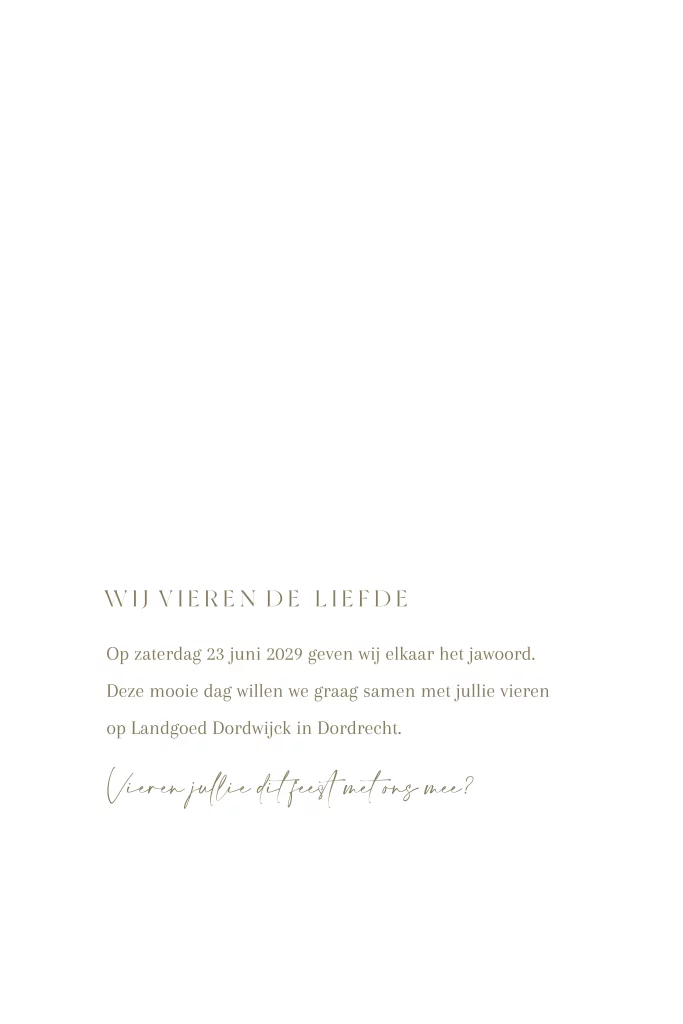 Een klassieke en stijlvolle trouwkaart met donkergroene teksten. Deze klassieke kaart is heel stijlvol door de combinatie van strakke lettertypes met sierlijke types. De initialen worden bovendien in goudfolie gedrukt voor een extra mooi effect.
