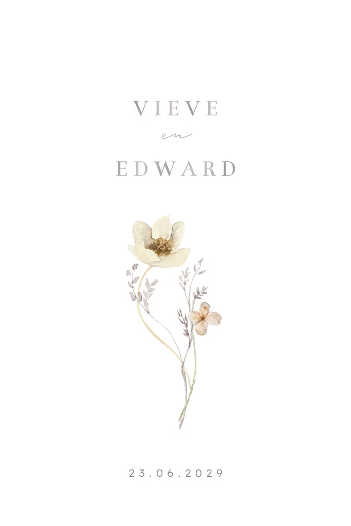 Deze romantische trouwkaart heeft prachtige aquarel bloemen. De achtergrond van de kaart is wit en de namen worden gedrukt in een lila spotlak. Je kunt ook kiezen voor andere foliekleuren.