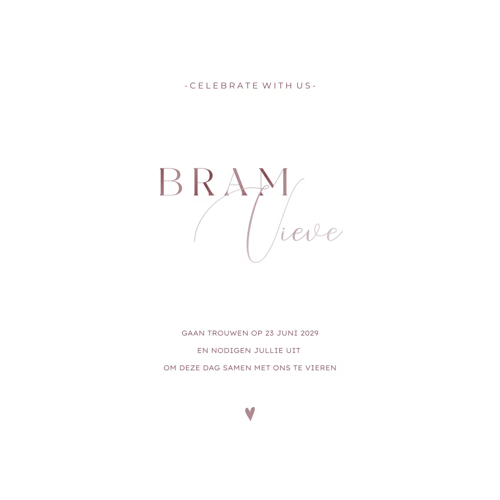 Zoek je een stijlvolle trouwkaart? Deze vierkante klassieke kaart is dan misschien iets voor jullie. De namen worden gedrukt in hoogglans, wat een extra chique effect geeft. Je kunt deze kaart ook afmaken met mooi zijden lint voor een extra klassiek effect.