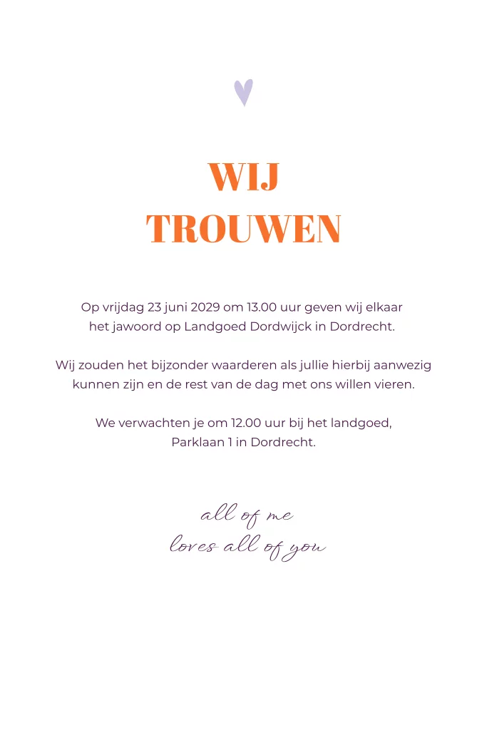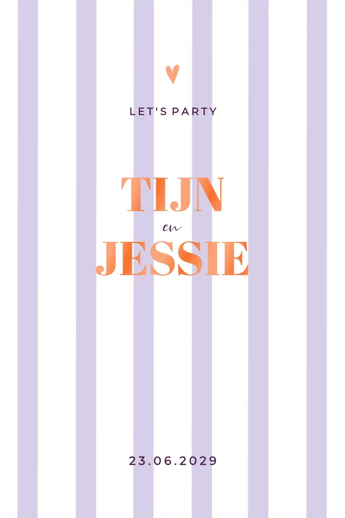 Op zoek naar een trendy trouwkaart met lila strepen en feloranje accenten? Zoek niet verder! Onze prachtige trouwkaart is perfect voor stellen die op zoek zijn naar een eigentijdse en opvallende uitnodiging voor hun speciale dag. De combinatie van lila strepen en feloranje geeft de kaart een frisse en moderne uitstraling die zeker de aandacht zal trekken. Met hoogglans lak accenten voor de namen wordt de kaart nog specialer en luxueuzer.