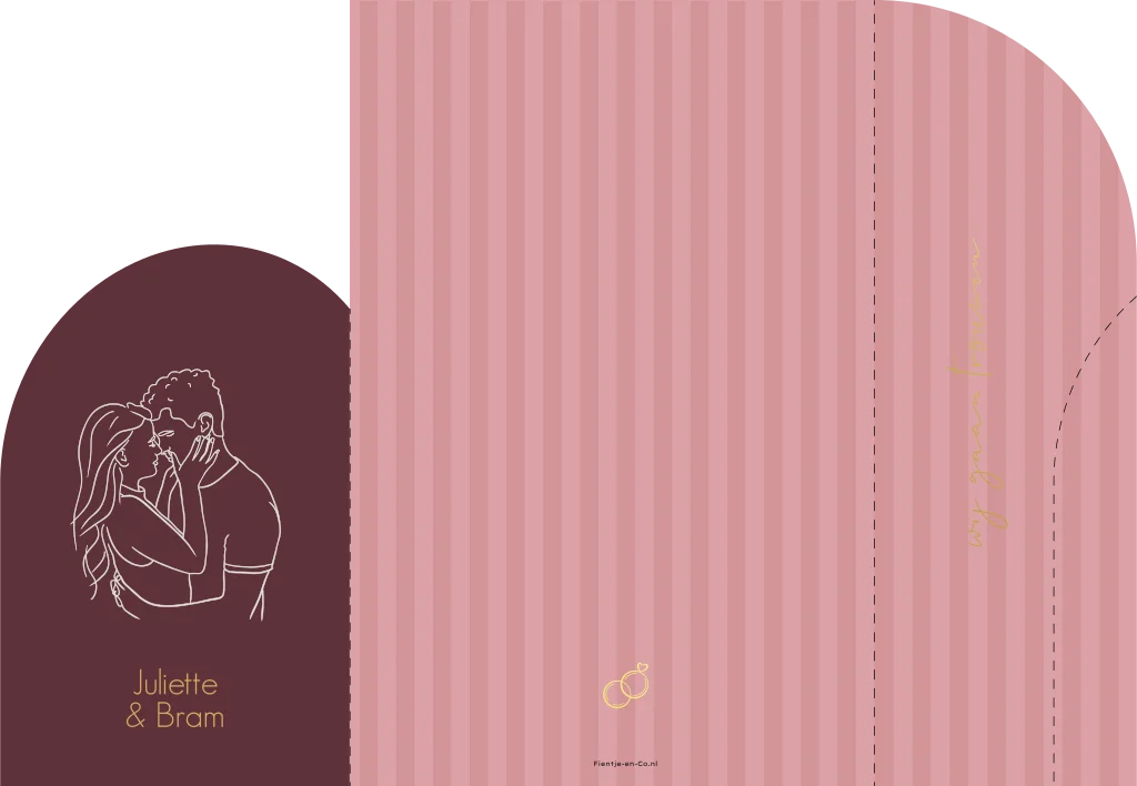 Trendy trouwkaart in roze en aubergine/donkerrood. De achtergrond heeft een roze strepenpatroon en het voorste luikje heeft een donkerrode achtergrond. Daarop staat een lijntekening van een verliefd koppel. We tekenen ook lijnillustraties op maat aan de hand van een goede foto. Vraag gerust advies of hulp. Unieke trouwkaart met goudfolie details. Aan de binnenkant vind je een duidelijke dagplanning met icoontjes.