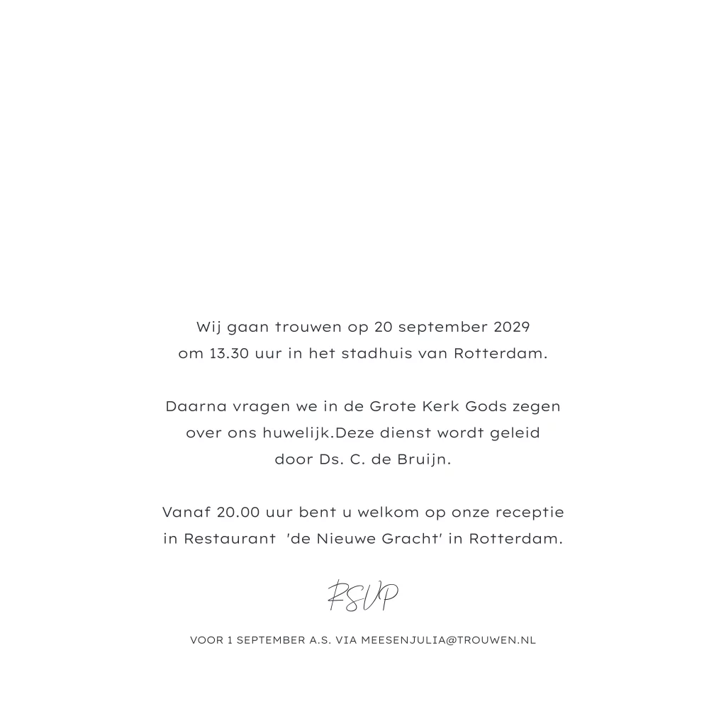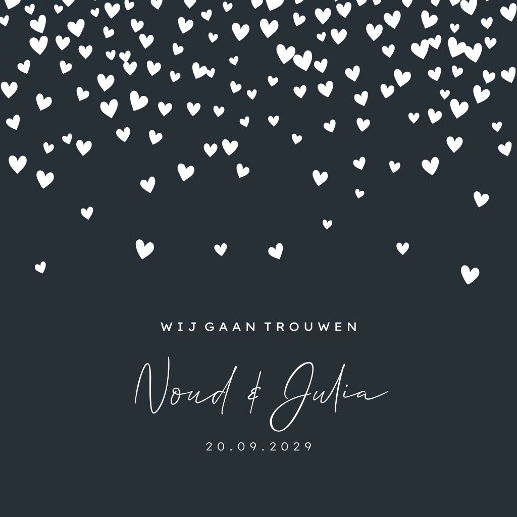 Donkerblauwe trouwkaart met hartjes van echt goudfolie. De hartjes valt als een regen over de kaart. Deze kaart voor jullie huwelijk kan je zelf bewerken in kleur en de folie kan je ook wijzigen.