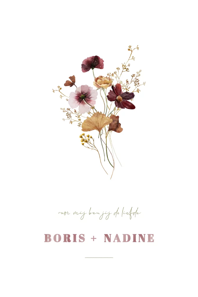 Deze stijlvolle trouwkaart is voorzien van een prachtig bloemenboeket in warme, natuurlijke tinten, gecombineerd met de namen van het bruidspaar in hoogglans. De subtiele glans van de namen geeft de kaart een luxe en elegante uitstraling, terwijl de romantische bloemen zorgen voor een persoonlijke en natuurlijke touch. De zachte kleuren en het verfijnde ontwerp maken deze kaart ideaal om jullie liefde op een unieke en bijzondere manier aan te kondigen.