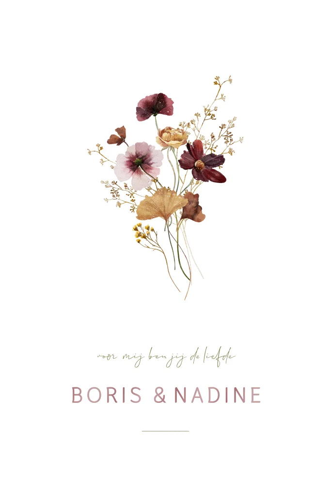 Deze stijlvolle trouwkaart is voorzien van een prachtig bloemenboeket in warme, natuurlijke tinten, gecombineerd met de namen van het bruidspaar in hoogglans. De subtiele glans van de namen geeft de kaart een luxe en elegante uitstraling, terwijl de romantische bloemen zorgen voor een persoonlijke en natuurlijke touch. De zachte kleuren en het verfijnde ontwerp maken deze kaart ideaal om jullie liefde op een unieke en bijzondere manier aan te kondigen.