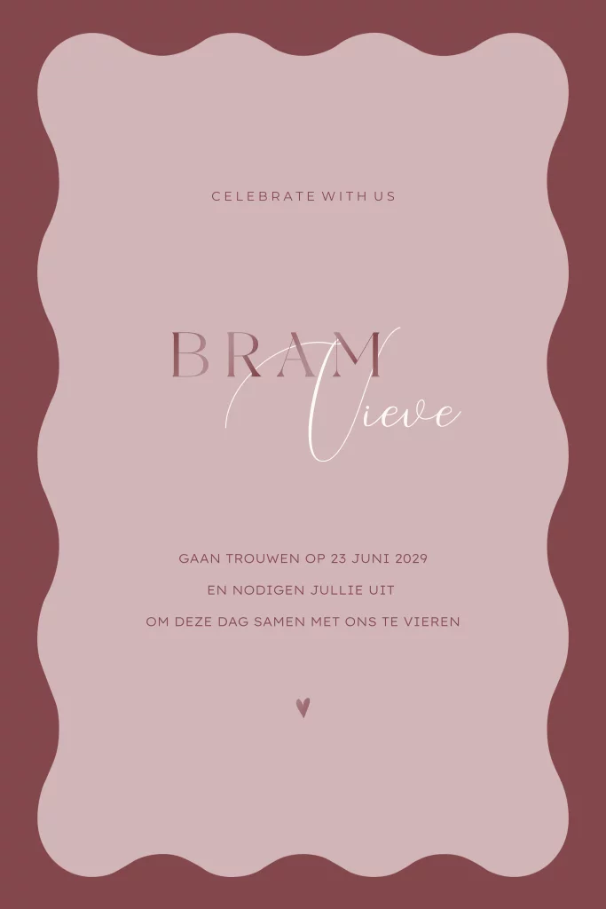 Deze trouwkaart heeft een donkerroze achtergrond en daarop een lichter roze vlak met een wave vorm. De namen worden gedrukt in hoogglans wat de kaart een extra mooi effect geeft.