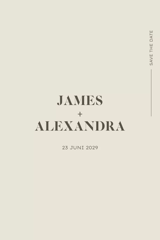 Een mooie beige save the datekaart met ronde hoeken. Op de kaart staan de namen in een stijlvol lettertype. De save the date tekst is verwerkt in een lijn. Bij deze kaart hebben we meerdere kaartjes, zodat de hele wedding stationary in een mooi geheel is.