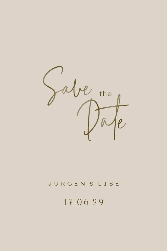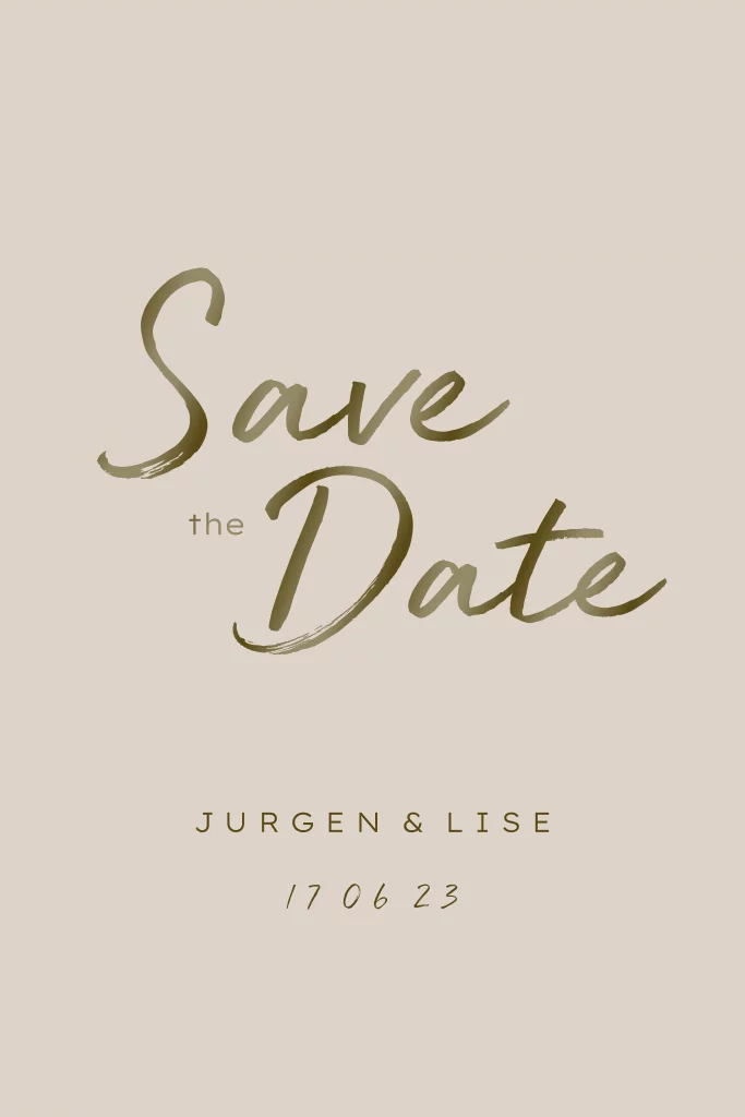 Moderne save the date kaart met een taupe achtergrond. Daarop staat de tekst save he date gedrukt in een bruine hoogglans. De kleuren van deze kaart kan je zelf aanpassen naar jullie themakleur.