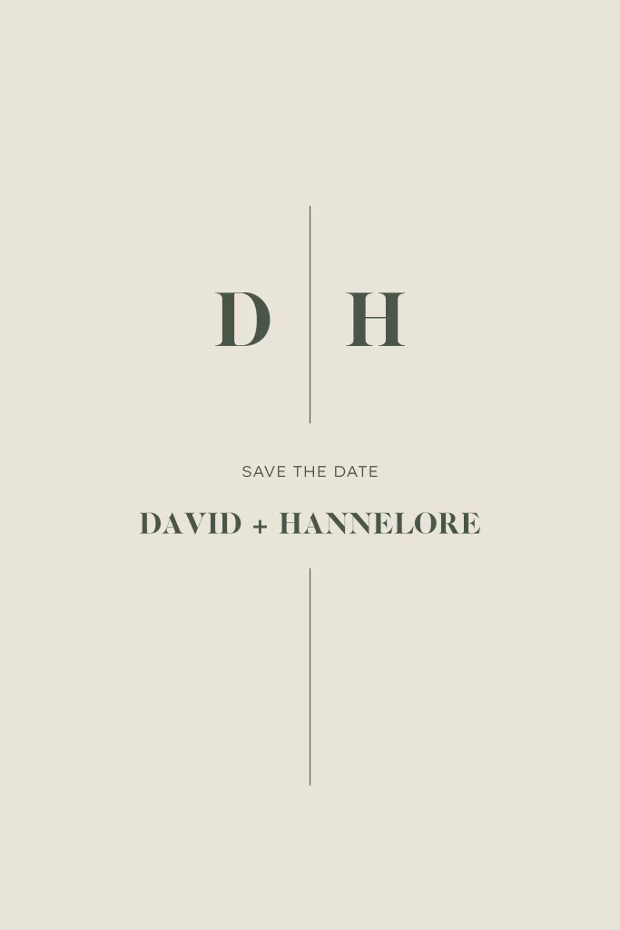 Enkele save the date kaart met een beige achtergrond. Op de voorkant staan strakke lijnen en initialen. De kleur van de tekst is donkergroen, je kunt alle kleuren van deze kaart natuurlijk zelf eenvoudig aanpassen in de editor.