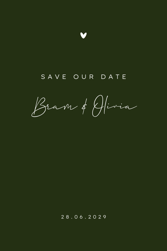 Mooie save-the-date kaart met een donkergroene achtergrond. Daarop staan teksten en een hartje in goudfolie. Dit geeft deze minimalistische kaart een chique uitstraling. Bewerk deze save the datekaart met jullie eigen gegevens. Bij deze kaart hebben we ook een bijpassende serie trouwkaarten. De ronde hoeken maken de kaart extra speciaal.