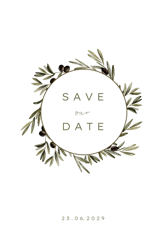 Enkele staande save the date kaart. De ronde krans heeft getekende olijftakken. Mooie savethedate voor jullie huwelijk.