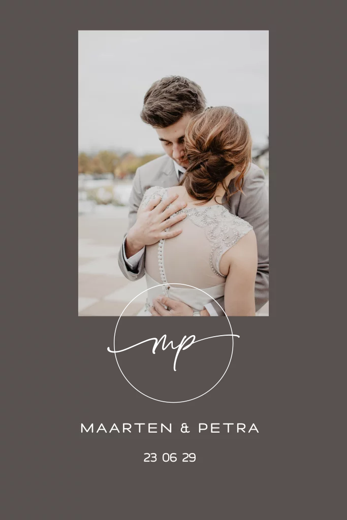 Deze save the date kaart is heel stijlvol. De achtergrond is donkerbruin en in het midden staat een foto. Daarop staat een goudfolie logo* met initialen.
