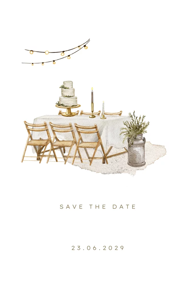 Deze save the date kaart is prachtig getekend. Een feestelijke diner tafel met een taart en kaarsen. De lampjes maken het feestje compleet. Nodig je gasten voor de bruiloft uit met deze mooie en unieke kaart. is stijlvol en kan je goed gebruiken voor een vintage bruiloft of een festival thema. Alle aquarel illustraties staan los op het kaartje en kan je zelf naar wens aanpassen. We hebben in deze stijl nog veel meer tekeningen, dus je kunt zo echt een unieke uitnodiging maken.