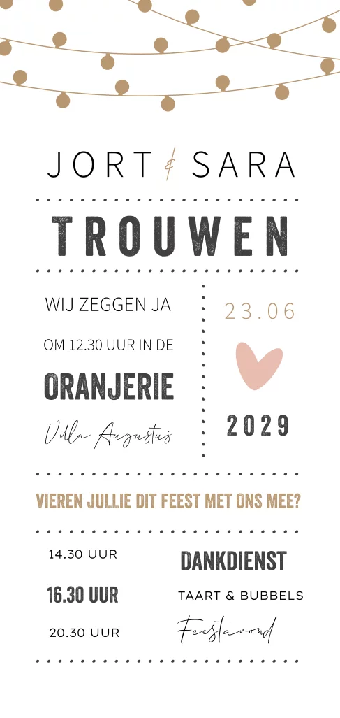 Trendy trouwkaart met bruine lampjesslinger. Op deze kaart staan de onderdelen van jullie trouwdag in verschillende typografie. Bij deze trouwkaart hoort ook een roze label met locaties.