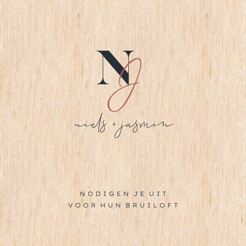 Houten trouwkaart in een vierkant formaat met mooie ronde hoeken. Deze kaart heeft initialen in donkerblauw en roestbruin. Kleuren kan je zelf aanpassen. Dit trouwkaartje wordt gedrukt op echt berkenhout en daardoor is iedere kaart uniek.