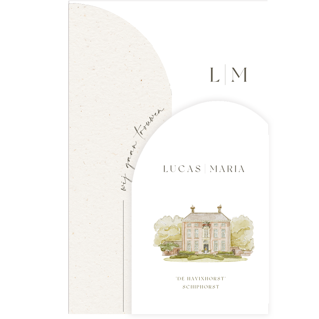 Een drieluik trouwkaart met mooie boogvormen. De linkerkant van de kaart is langer dan de rechterkant, die geeft de kaart een heel mooi effect. Aan de rechterkant staat een illustratie van trouwlocatie de havixhorst. Links staat een tekst in boogvorm 'wij gaan trouwen'. We kunnen de tekst naar wens aanpassen. Trouwen jullie op een andere locatie, vervang de illustratie door een andere uit onze beeldbank. Of laat jullie locatie natekenen door ons.