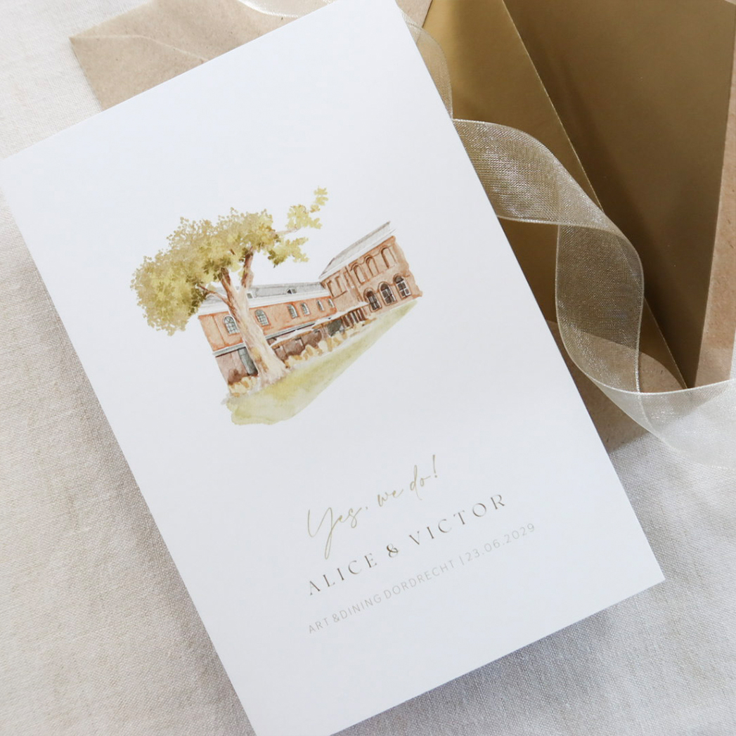 Unieke trouwkaart met een getekende trouwlocatie van Art en Dining in Dordrecht. De illustratie van het kasteel is uniek en door onszelf getekend. Je kunt de illustratie ook vervangen door een andere trouwlocatie uit onze beeldbank.