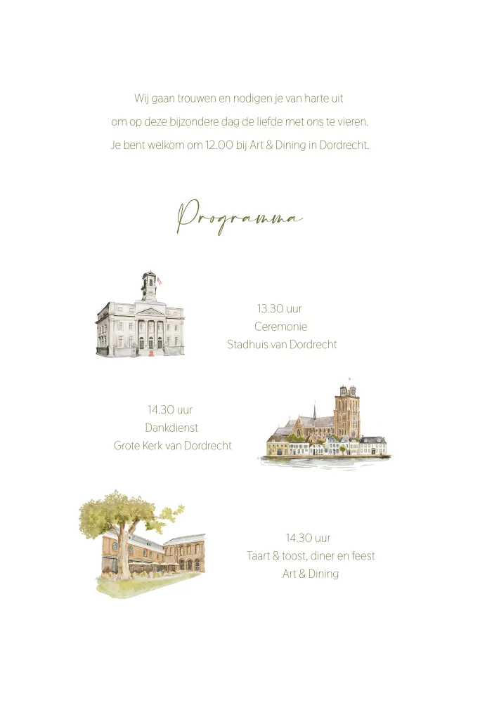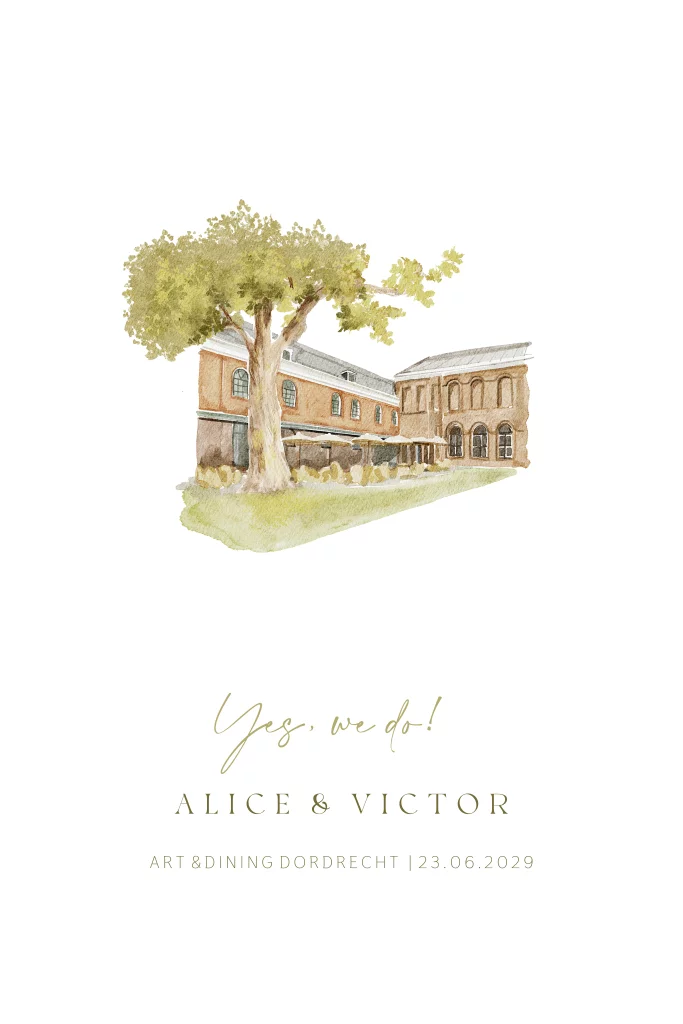 Unieke trouwkaart met een getekende trouwlocatie van Art en Dining in Dordrecht. De illustratie van het kasteel is uniek en door onszelf getekend. Je kunt de illustratie ook vervangen door een andere trouwlocatie uit onze beeldbank.