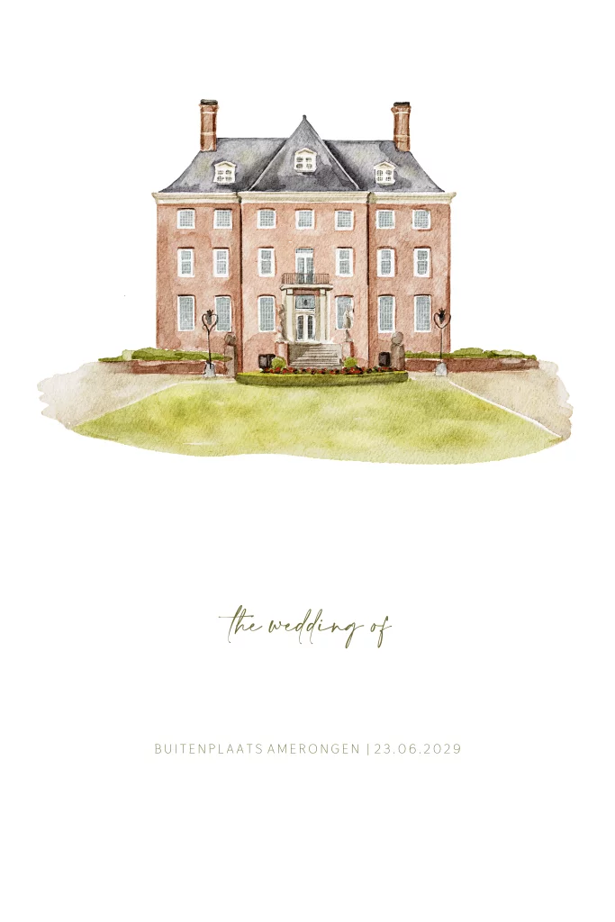 Onze trouwkaarten worden stuk voor stuk met de hand getekend en zijn nergens anders verkrijgbaar. De illustratie van de trouwlocatie is met liefde getekend en vormt het hart van deze kaart. Of jullie nu écht trouwen op Buitenplaats Amerongen of gewoon verliefd zijn op de romantische uitstraling ervan, deze kaart geeft direct de sfeer van jullie grote dag weer. Je kunt de locatie ook vervangen door een andere trouwlocatie uit onze beeldbank, of laat hem tekenen door ons. Personaliseer eenvoudig in onze editor voor jullie speciale dag.
