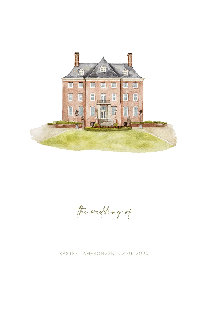 Laat jullie liefde stralen met deze unieke trouwkaart met getekende trouwlocatie van Kasteel Amerongen. Deze stijlvolle kaart is exclusief verkrijgbaar bij Fientje & Co en is met zorg geïllustreerd in een prachtige aquarelstijl. De mooie waterverf details brengen de historische sfeer van het kasteel van Amerongen heel mooi tot leven. Onze trouwkaarten worden stuk voor stuk met de hand getekend en zijn nergens anders verkrijgbaar. Of jullie nu écht trouwen op Buitenplaats Amerongen of gewoon verliefd zijn op de romantische uitstraling ervan, deze kaart geeft direct de sfeer van jullie grote dag weer. Je kunt de locatie ook vervangen door een andere trouwlocatie uit onze beeldbank, of laat hem tekenen door ons. Personaliseer eenvoudig in onze editor voor jullie speciale dag.