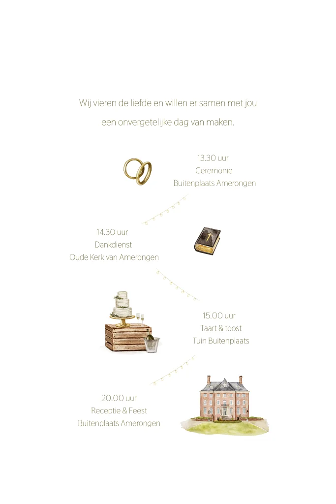 Laat jullie liefde stralen met deze unieke trouwkaart met getekende trouwlocatie van Kasteel Amerongen. Deze stijlvolle kaart is exclusief verkrijgbaar bij Fientje & Co en is met zorg geïllustreerd in een prachtige aquarelstijl. De mooie waterverf details brengen de historische sfeer van het kasteel van Amerongen heel mooi tot leven. Onze trouwkaarten worden stuk voor stuk met de hand getekend en zijn nergens anders verkrijgbaar. Of jullie nu écht trouwen op Buitenplaats Amerongen of gewoon verliefd zijn op de romantische uitstraling ervan, deze kaart geeft direct de sfeer van jullie grote dag weer. Je kunt de locatie ook vervangen door een andere trouwlocatie uit onze beeldbank, of laat hem tekenen door ons. Personaliseer eenvoudig in onze editor voor jullie speciale dag.| Totaalprijs: 0 |