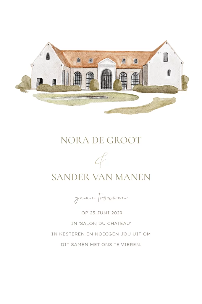 Unieke en stijlvolle trouwkaart met een illustratie van een trouwlocatie. Deze is van de salon van molen de zwaluw. We kunnen iedere locatie voor jullie tekenen, zo krijg je een unieke uitnodiging voor jullie huwelijk.