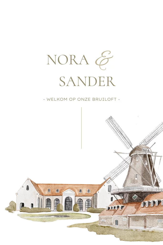 Trouwkaart met een afbeelding van een trouwlocatie. Gaan jullie trouwen in Molen de Zwaluw, dan is deze uitnodiging perfect voor jullie. We kunnen voor elke trouwlocatie een illustratie op maat tekenen voor jullie. Neem dan contact op.