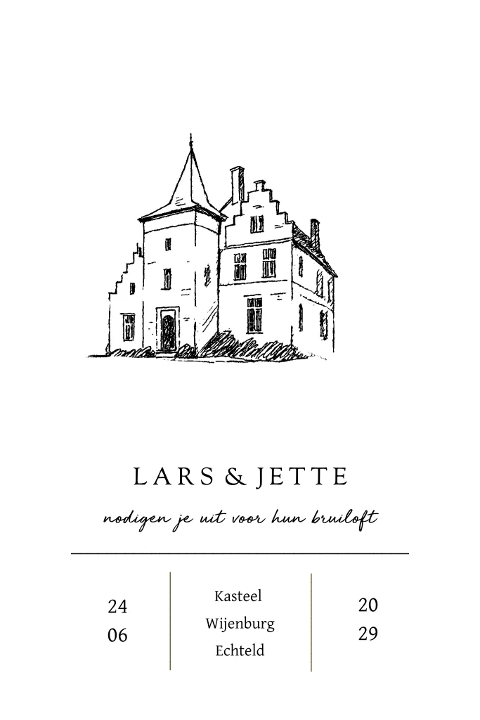 Trouwkaart met een illustratie van een trouwlocatie in een pentekening. Deze kaart heeft een illustratie van kasteel Wijenburg in Echteld. Ga je hier trouwen dan is deze trouwkaart perfect voor jullie. De locatie is getekend in een zwarte potlood stijl, maar je kunt de kleuren op de kaart ook naar wens aanpassen. Je kunt ook een trouwlocatie in deze stijl laten ontwerpen door ons.