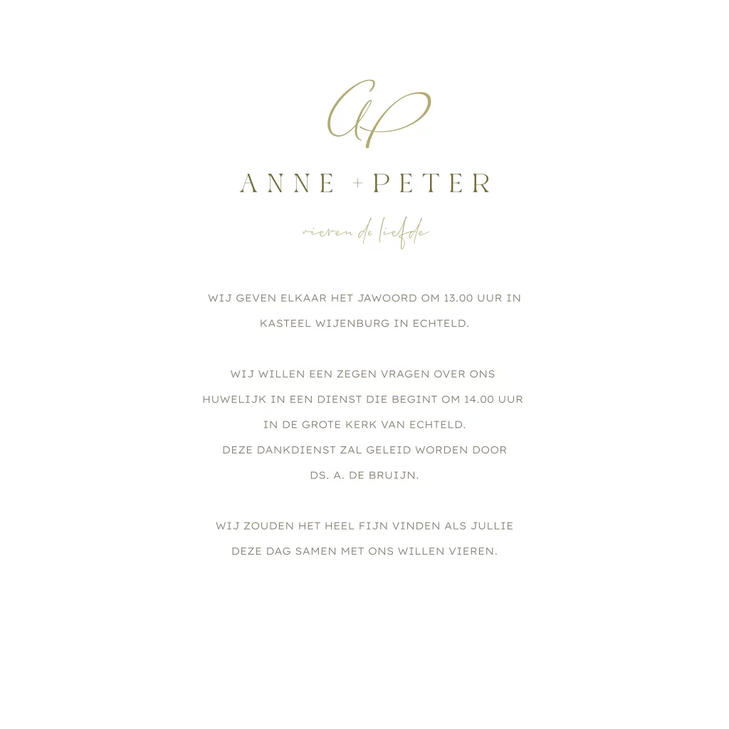 Unieke trouwkaart met een waterverf illustratie van Kasteel Wijenburg in Echteld. Op de voorkant staat de tekening van het kasteel met initalen en jullie namen. Bewerk deze trouwkaart zelf. Wil je een eigen illustratie van jullie trouwlocatie, neem dan contact met ons op.