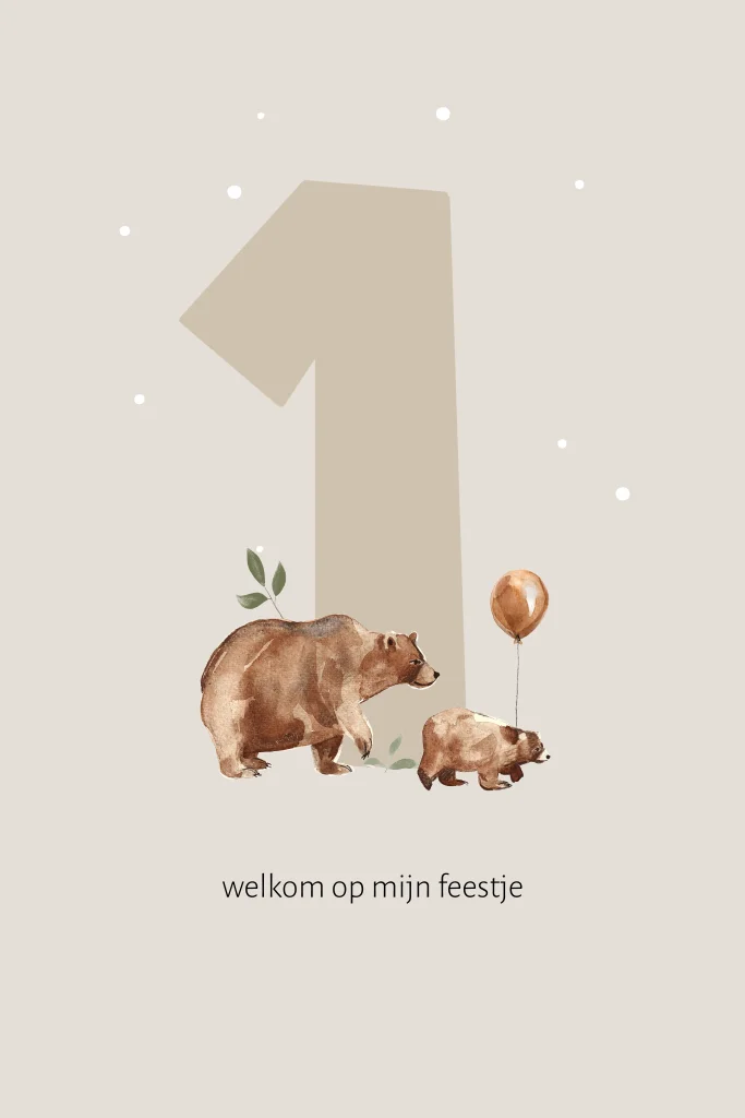 Uitnodiging voor een kinderfeestje met getekende beren. De kleine beer heeft een ballon in zijn poot. Op de achtergrond staat een grote 1, deze kan je zelf aanpassen als jullie kindje een andere leeftijd heeft.