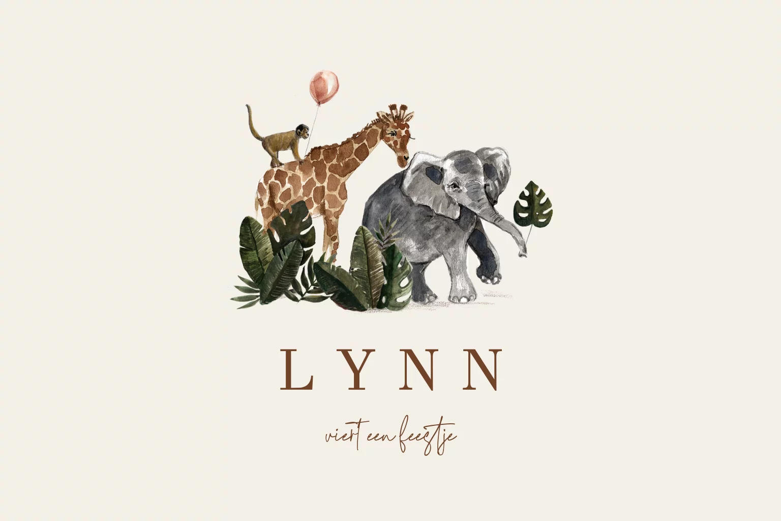 Vrolijke uitnodiging voor een verjaardag van een meisje. De jungledieren lopen achter elkaar en het kleine aapje houdt een roze ballon vast. Deze kaart kan je zelf bewerken in onze editor.