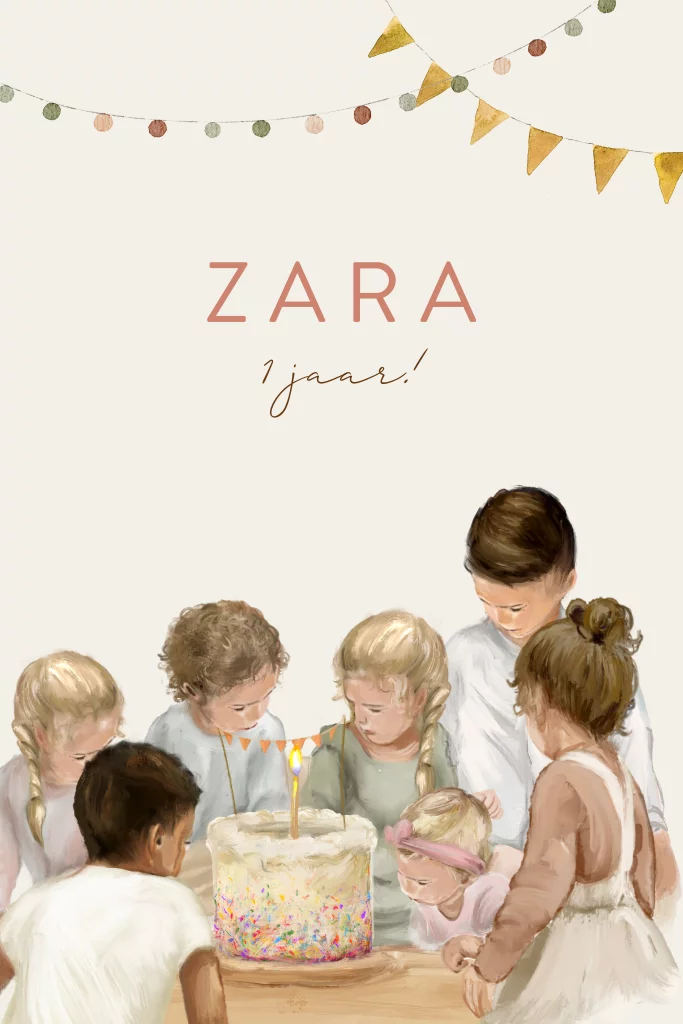 Uitnodiging verjaardag taart met kindjes en vrolijke slingers