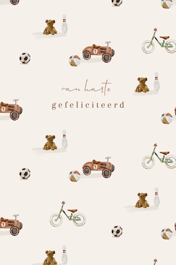 Wenskaart voor een verjaardag met op de achtergrond een patroon van speelgoed. Op het patroon staat een beertje, een loopauto en een leuk kinder fietsje.